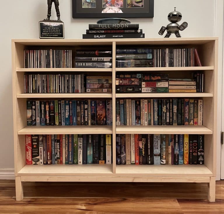 I built the above bookshelf to fit our entryway. I often feel that bookshelves are made too deep, so if I needed to I could’ve customized this one to be more shallow. Since I had the space though, I just used the default plans which you can find here. I did add another tier of shelves to this, and although it’s far from perfect, it’s certainly functional. Annnnd, by now this bookcase is most definitely double-shelved, so I guess I ended up needing the extra depth anyway, lol.